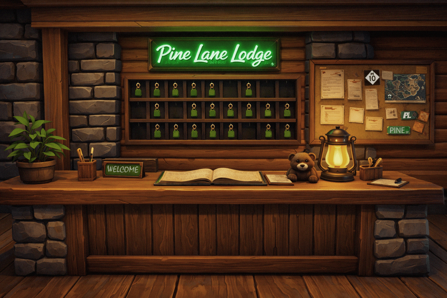 The Lodge houses Pine Lane National Park’s only guest rooms and it's most reliable radio signal. It’s where broadcasts come through the clearest, and where visitors often decide to stay a little longer than planned.
